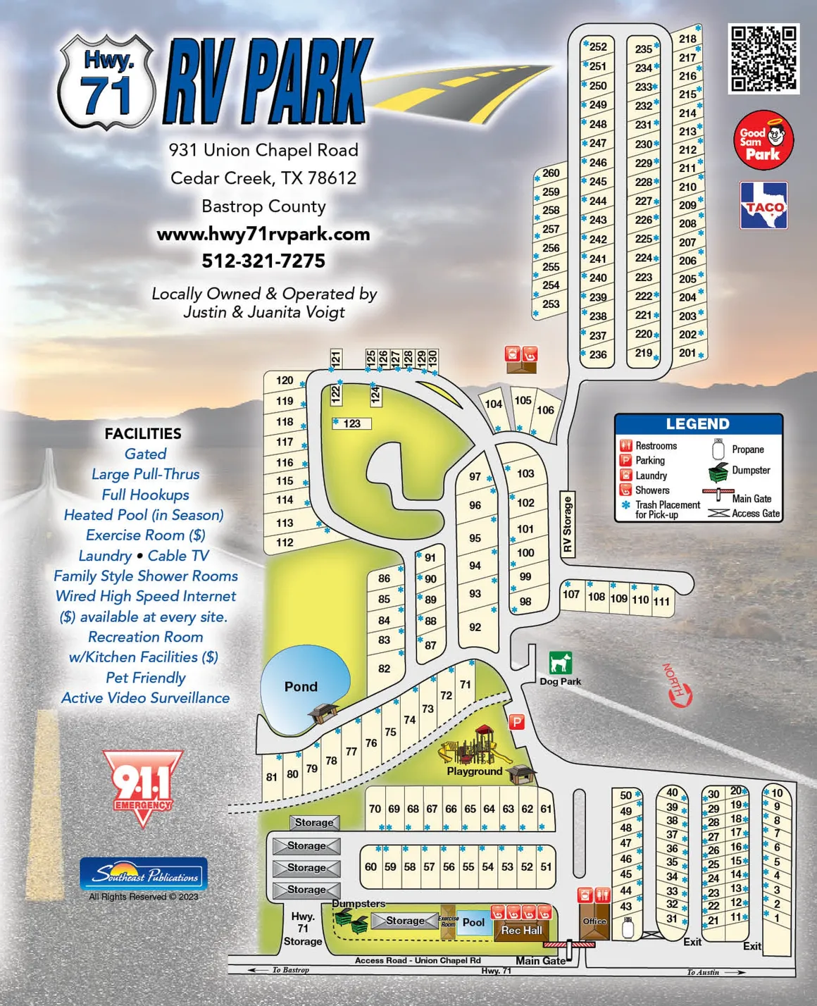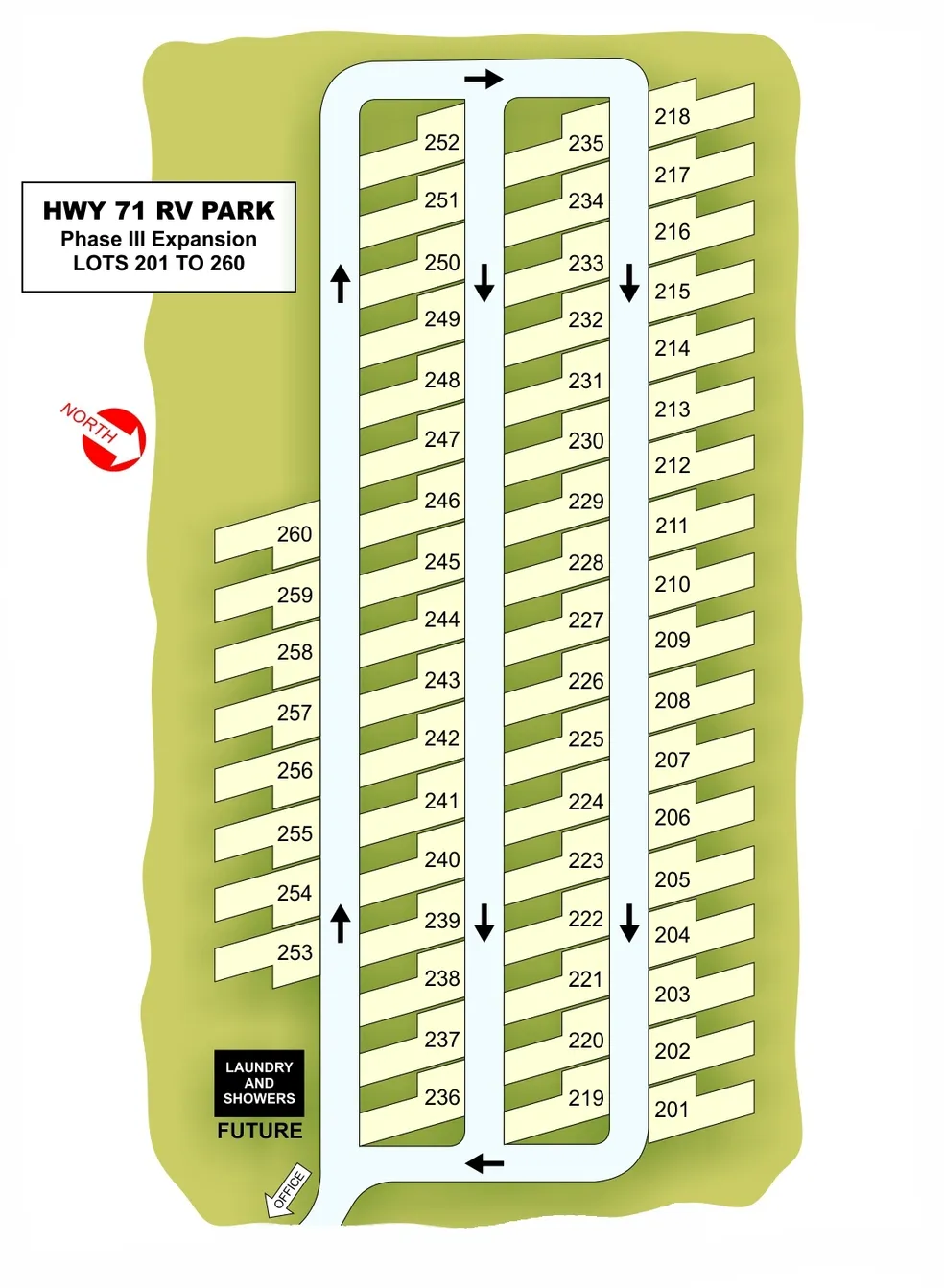Use the park map below to get familiar with RV site locations, amenities, and common areas before your stay. The map is provided to help guests navigate the park and plan their arrival.